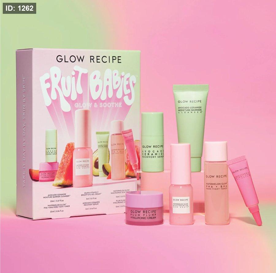 مجموعة Glow Recipe Fruit Babies Glow & Soothe هي باكج مصغّر يجمع أفضل منتجات Glow Recipe لترطيب البشرة بعمق وتهدئة الاحمرار وتحسين ملمس البشرة مع لمعة نضرة طبيعية. تركيباتها مستخلصة من الفواكه الغنية بالفيتامينات مثل البطيخ، البرقوق، الجوافة والأفوكادو، لتمنح البشرة ترطيب، تفتيح، تهدئة وإشراقة زجاجية (Glass Skin) من غير ما تترك لمعة مزعجة أو إحساس دهني.