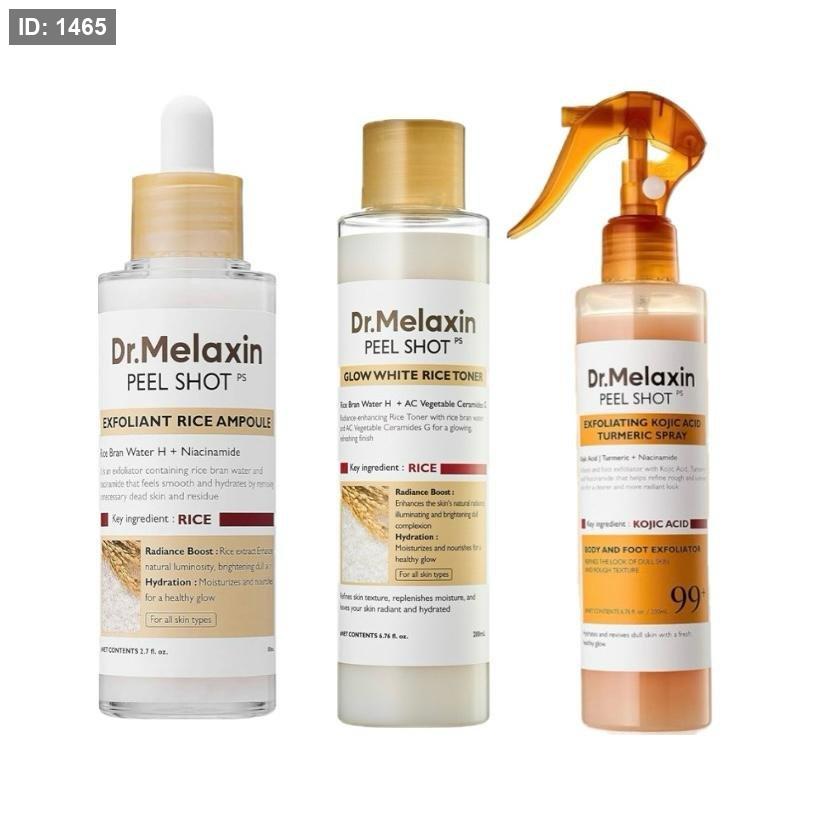 Dr. Melaxin Peel & Bright Expert Set – نظام تقشير وتجديد متكامل يحتوي على خلاصة الأرز، النياسيناميد، وحمض الكوجيك للمساعدة في إزالة الخلايا الميتة، توحيد اللون، وتحسين ملمس البشرة.